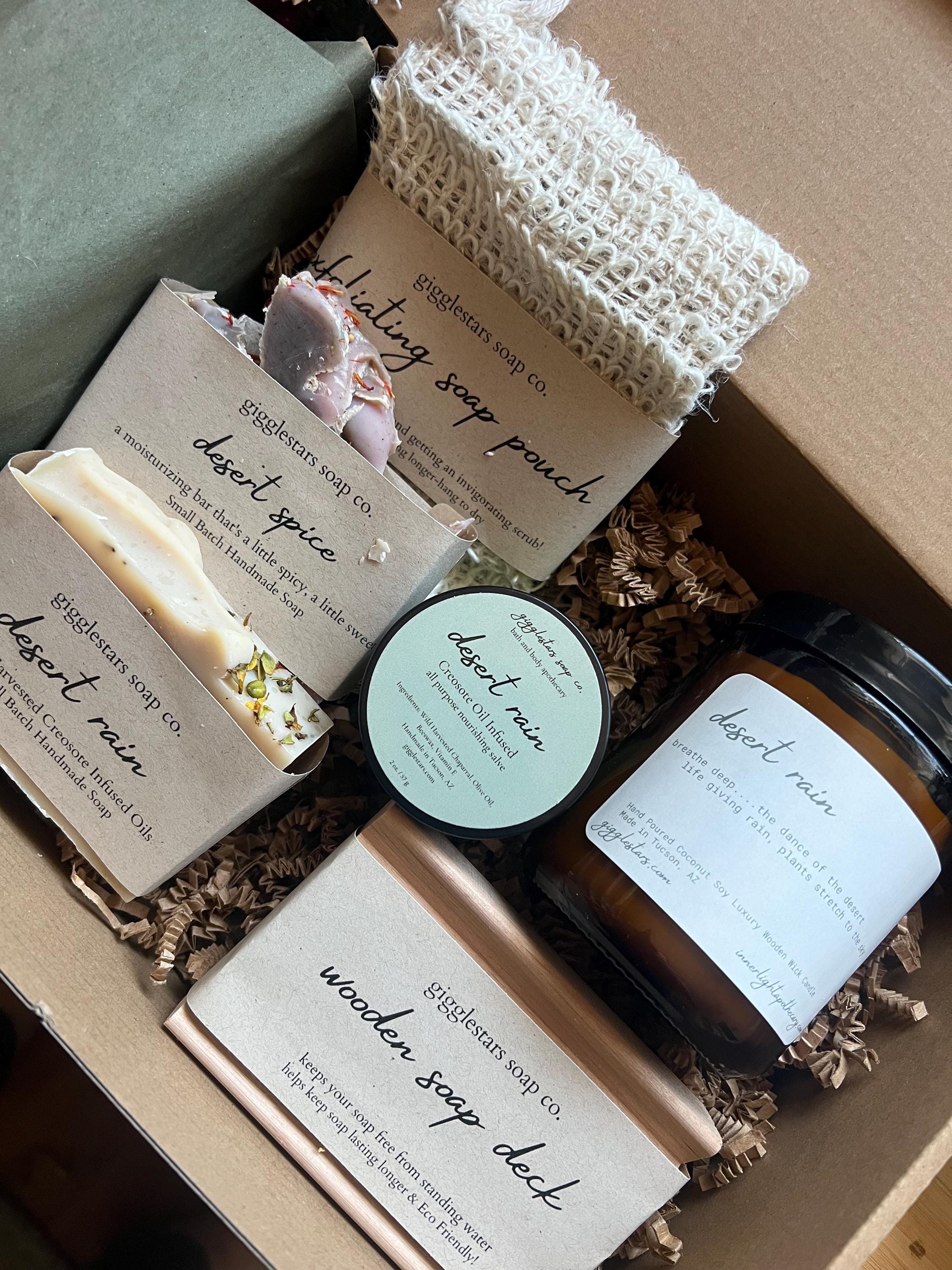DESERT RAIN Deluxe Desert Theme Handmade gift box set | Cold Process Natural Hand Crafted Soap, Salve, Candle
