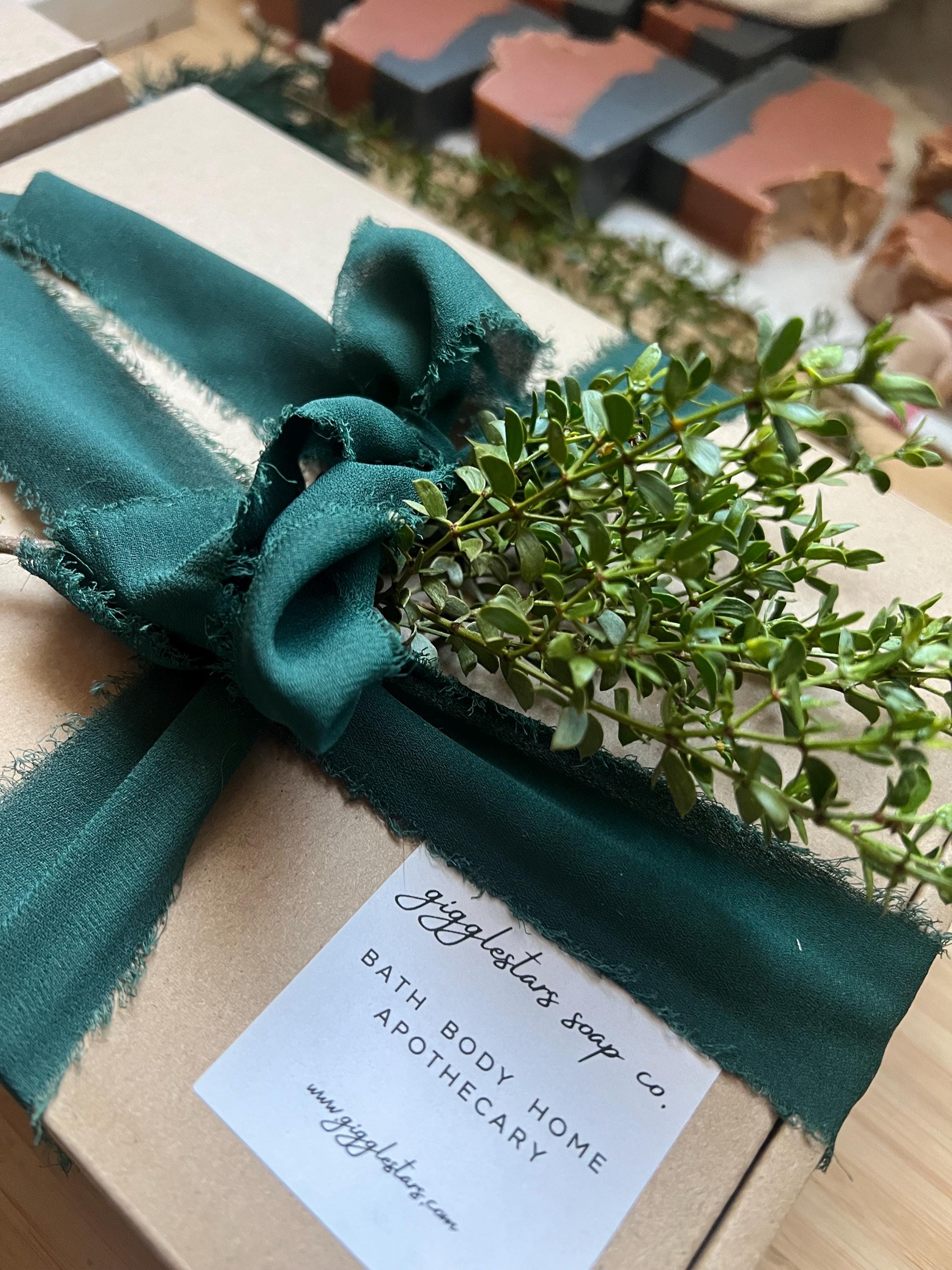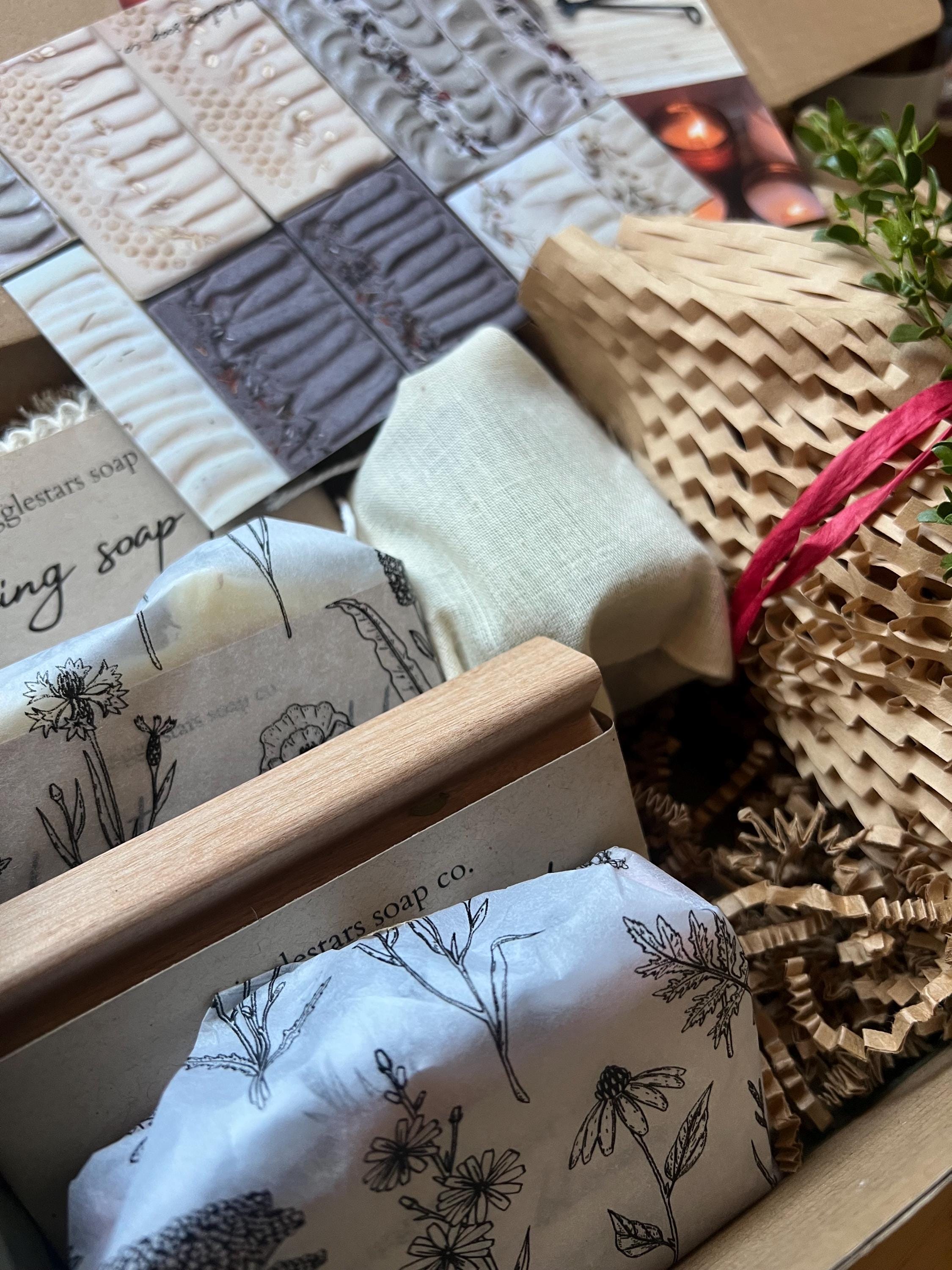 Also included is a Wooden Soap Dish, an exfoliating Sisal Soap Saver Bag, and a wonderfully nourishing skin salve made with Creosote, also known as Chaparral.