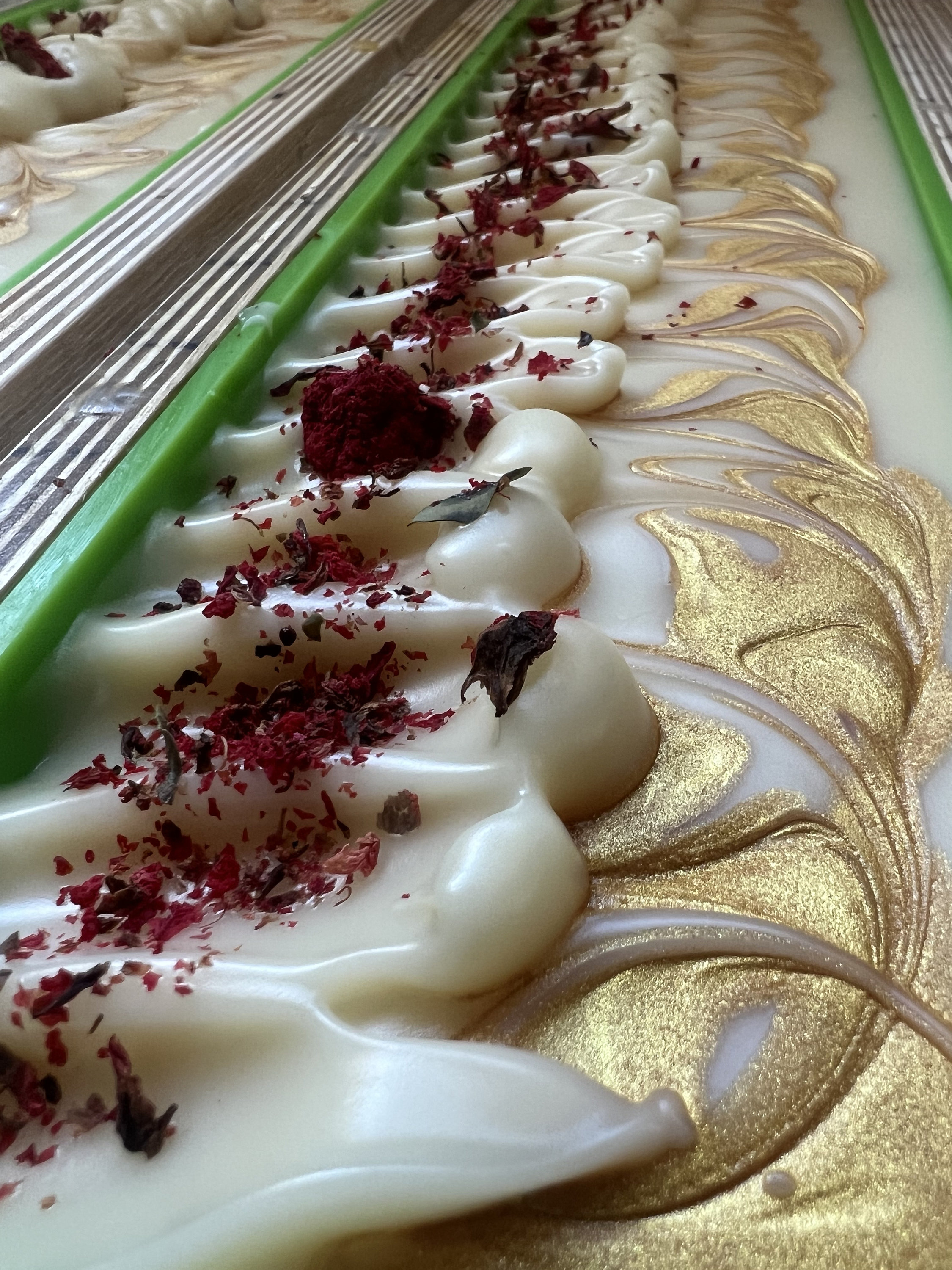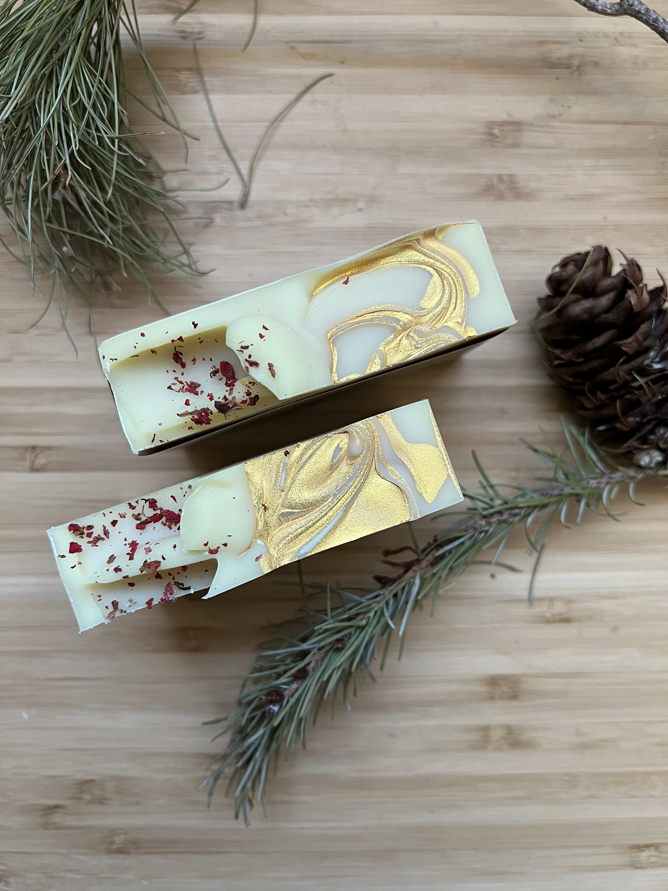 Olive Oil, Coconut Oil, Distilled Water, Avocado Oil, Sodium Hydroxide, Castor Oil, Cocoa Butter, Fragrance Oil, Pomegranate Flowers, Gold Mica.