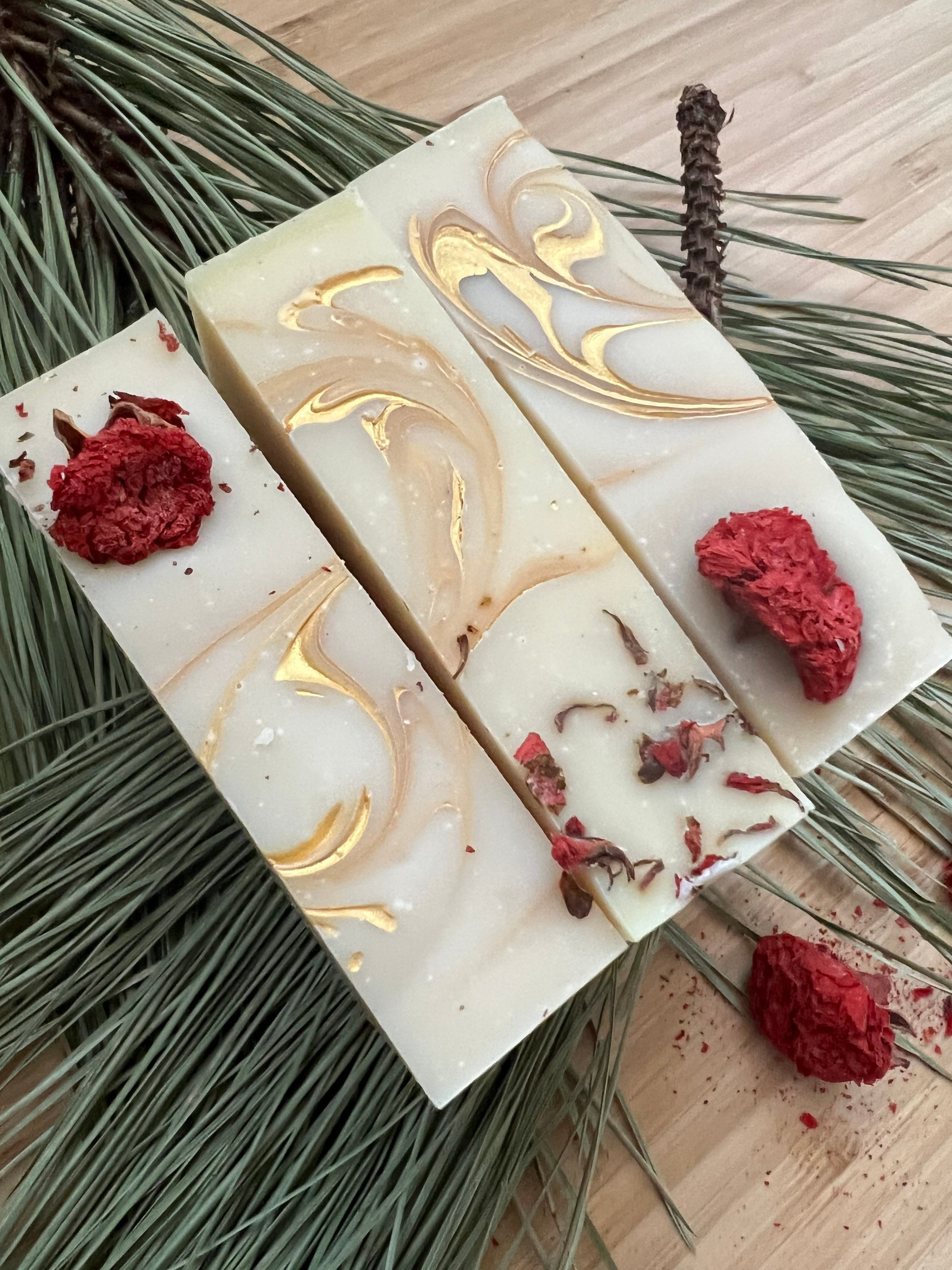 Winter Wonderland soap is a fresh and uplifting blend that has notes of bergamot, lime, earl grey tea, amber, and musk, swirled into a base of cruelty free oils. This soap lathers beautifully and smells so fresh and clean, like newly fallen snow. Pomegranate flowers and a Gold Mica Swirl grace the top of this beautiful soap. Year after year, this is a best selling soap.