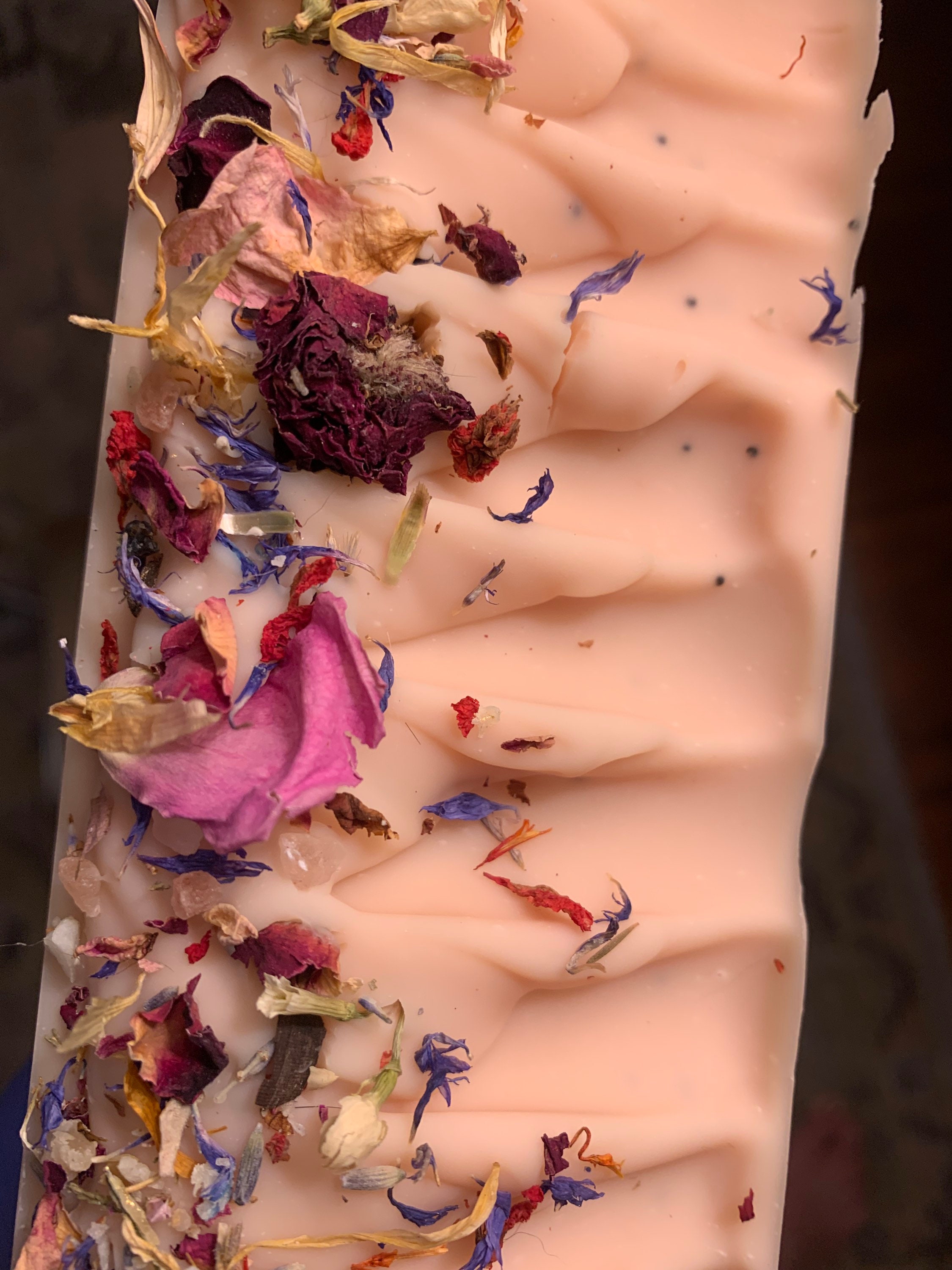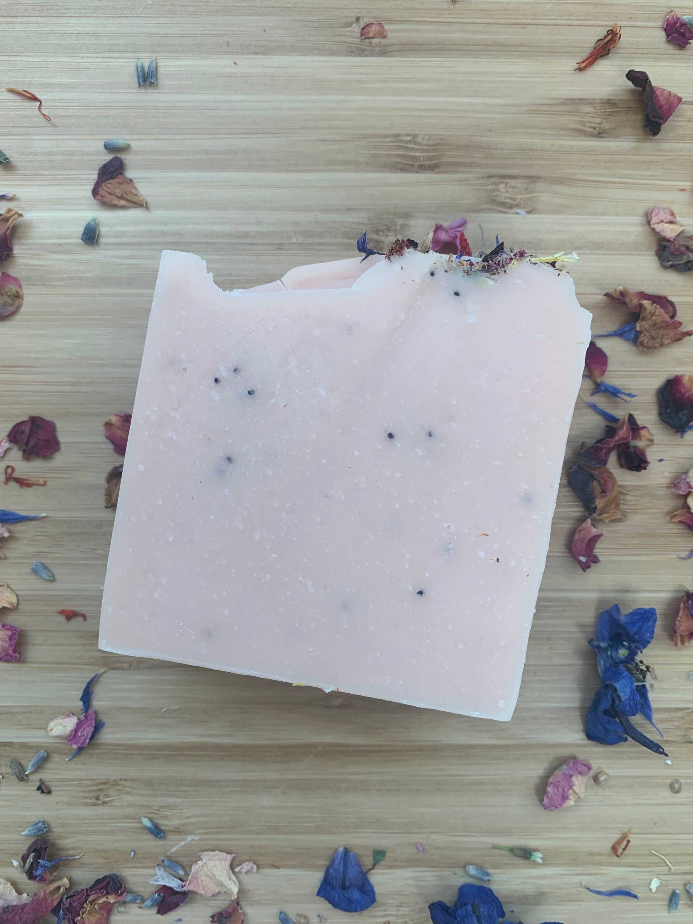 Olive Oil, Coconut Oil, fresh Aloe Vera juice, Avocado Oil, Sodium Hydroxide, Shea Butter, Castor Oil, Grapefruit Essential and Fragrance Oils, Calamine Powder, Pink Himalayan Salt, Poppyseeds, dried flowers.