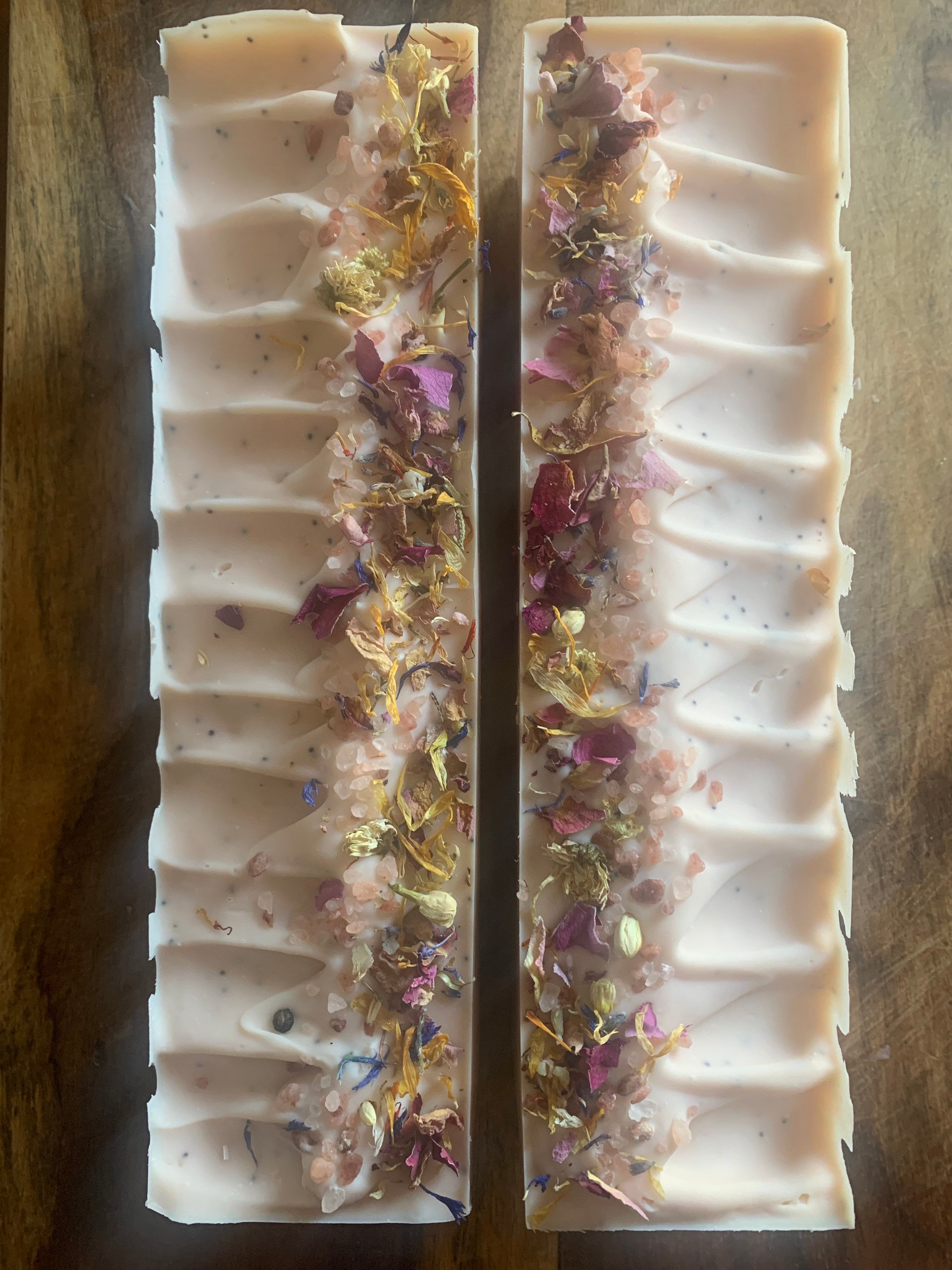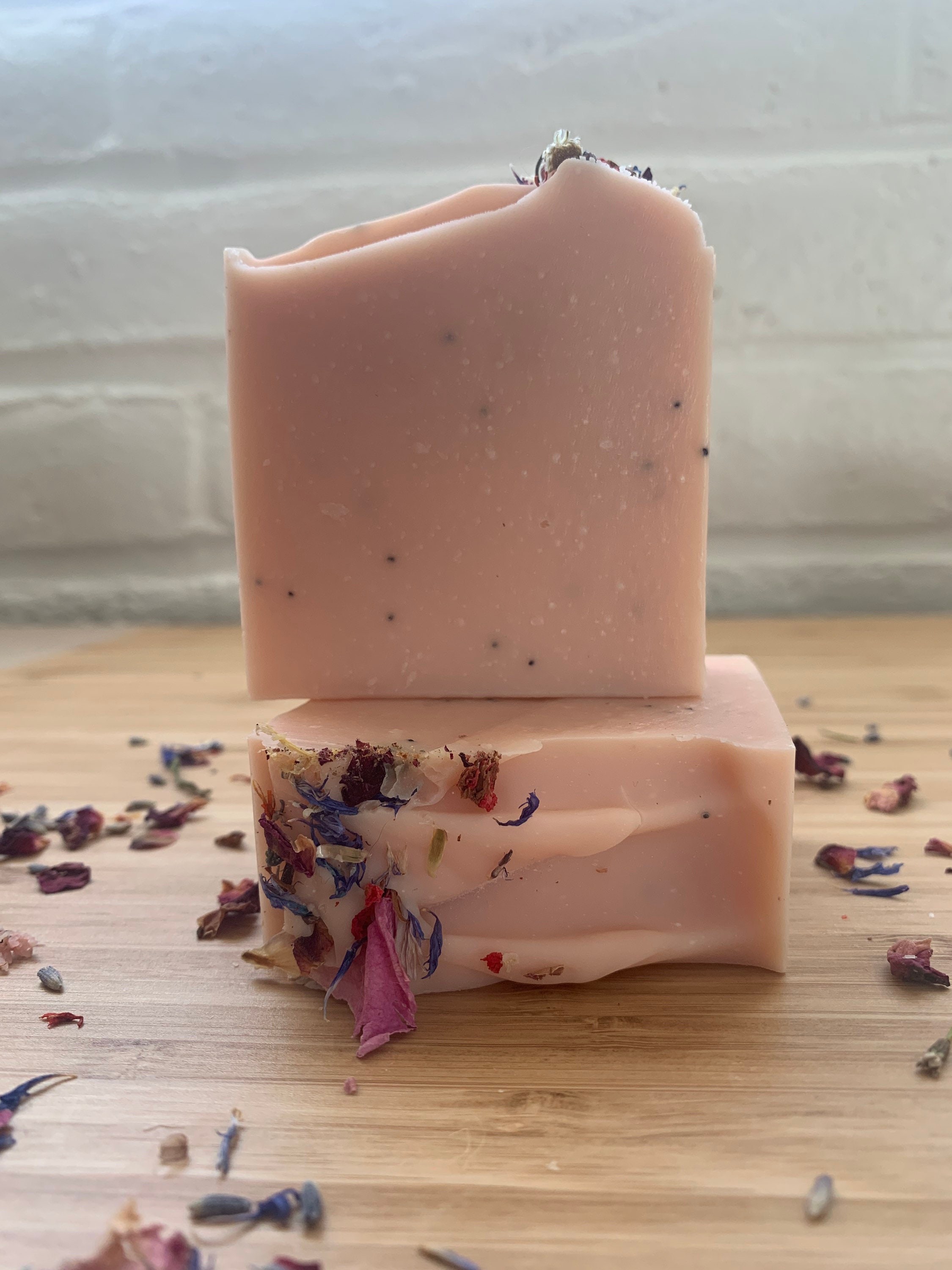 Blush is a beautiful soap made with fresh Aloe Vera juice, along with Grapefruit Essential and Fragrance Oils. It is light and fresh and blended into a moisturizing hand mixed soap base along with Shea butter and Avocado oil, which add extra skin softening benefits. It is blended with poppyseeds, which give a light exfoliation and topped with Pink Himalayan Salt and a blend of dried flowers. The beautiful pink is from Calamine Powder, which also provides a skin soothing benefit.